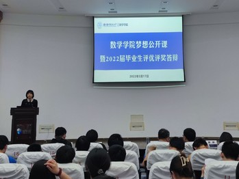 经学生自主报名、学院资格审查,共有8位候选人参加此次答辩。答辩会上,毕业生们从专业学习、科创竞赛、志愿服务、社会实践等多个方面,总结了他们四年的大学生活,并表达了对学校、老师以及同学的感谢之情,“成长”一词贯穿始终。多门课程满分的“五星级教员”朱林昊同学为这场答辩会拉开了序幕,他曾参加并主持的多项大创项目,获各类荣誉奖项30余项,为自己大学四年生活交上了一份堪称完美的答卷;在学科交叉研究上大放异彩的张纪缘同学不仅在学习与社会实践上双管齐下,还兼顾了自己诗歌散文歌曲创作的爱好;来自海南自身理学基础薄弱的杨逸同学分享了他向阳而生,逆风翻盘的精彩故事……8位答辩同学风采各异,却都同样精彩,为台下的学弟学妹们展示了大学生活的无限可能。答辩结束后,周佼佼对此次答辩会进行了点评。她提到,毕业生同学展示了优秀数学学子风采,对他们在大学取得的成长和收获表示祝贺,并寄语低年级同学以优秀学长学姐为榜样,向优秀毕业生学习,增强专业信心、努力奋进,收获属于自己的精彩大学。