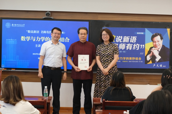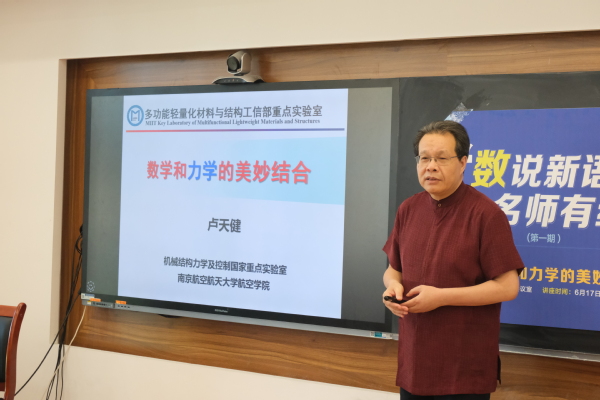 6月17日,桃子视频 在理学楼519会议室举办第一期“数说新语,名师有约”讲座交流活动。国家级人才、多功能轻量化材料与结构研究中心主任、航空学院教授卢天健做了题为《数学和力学的美妙结合》的专题讲座。桃子视频 党委书记许静、院长王春武、院党委副书记周佼佼、辅导员以及桃子视频 、物理学院约40名同学参加活动。活动由周佼佼主持。