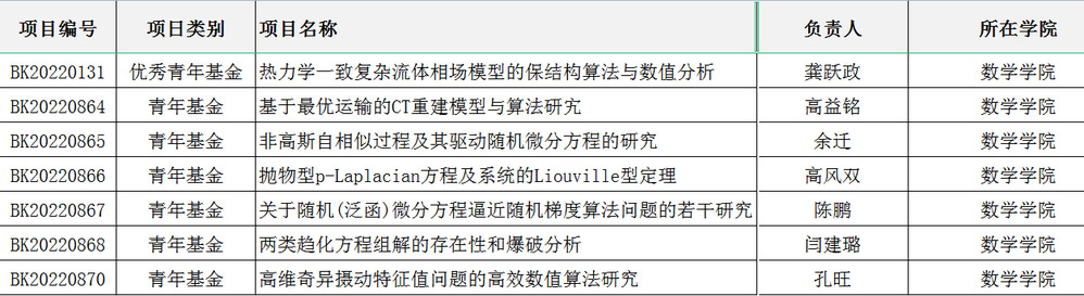 同样地,在今年5月份公布的江苏省自然科学基金立项结果中,数学学科也刷新了历史最好成绩,获得了7项资助,其中包括了龚跃政副教授的1项优秀青年基金项目和其他6项青年项目。