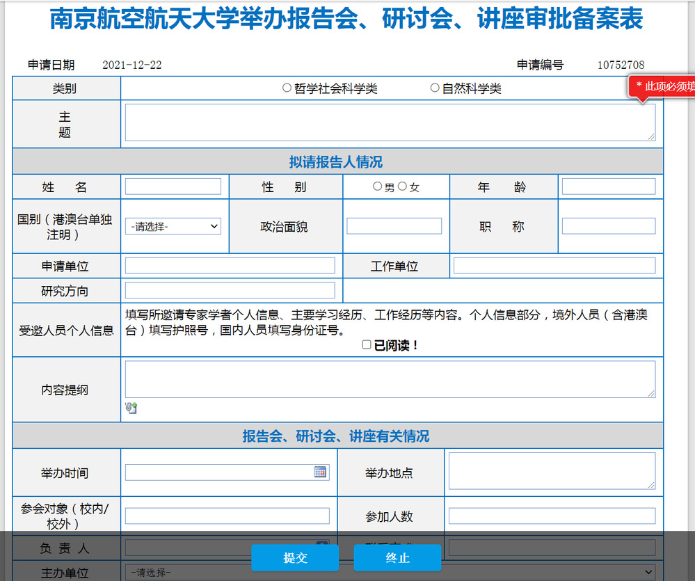 3. 点击页面最下方“开始办理”按钮(勾选我已阅读),进入填写页面。请按要求填写各项内容,然后提交审批。本单位审批请提交给学院科研副院长。