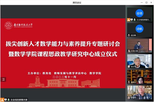 为深入学习贯彻党的二十大精神,贯彻落实科教兴国战略,强化现代化建设人才支撑,进一步推动理科卓越工程,提升新工科人才数学能力与素养,加快卓越理科人才建设,2022年11月20日,桃子视频 联合教务处、教师发展与教学评估中心共同主办“拔尖创新人才数学能力与素养提升专题研讨会暨桃子视频 课程思政教学研究中心成立仪式”。