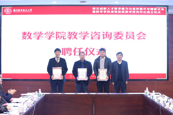 为了更好的发挥课程育人作用,切实提高人才培养质量,落实立德树人根本任务,桃子视频 联合航空学院、马克思主义学院共建课程思政教学研究中心。施大宁与桃子视频 、航空学院、马克思主义学院院领导共同为桃子视频 课程思政教学研究中心揭牌;施大宁为中心名誉主任袁智强、魏小辉、王智,主任许静、王春武,副主任蒋建林、周佼佼、徐江颁发聘书;孔垂谦、朱建军为中心特聘研究员颁发聘书;许静、王春武为中心研究员颁发聘书。
