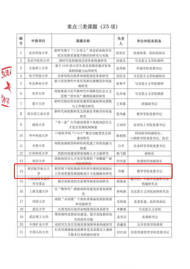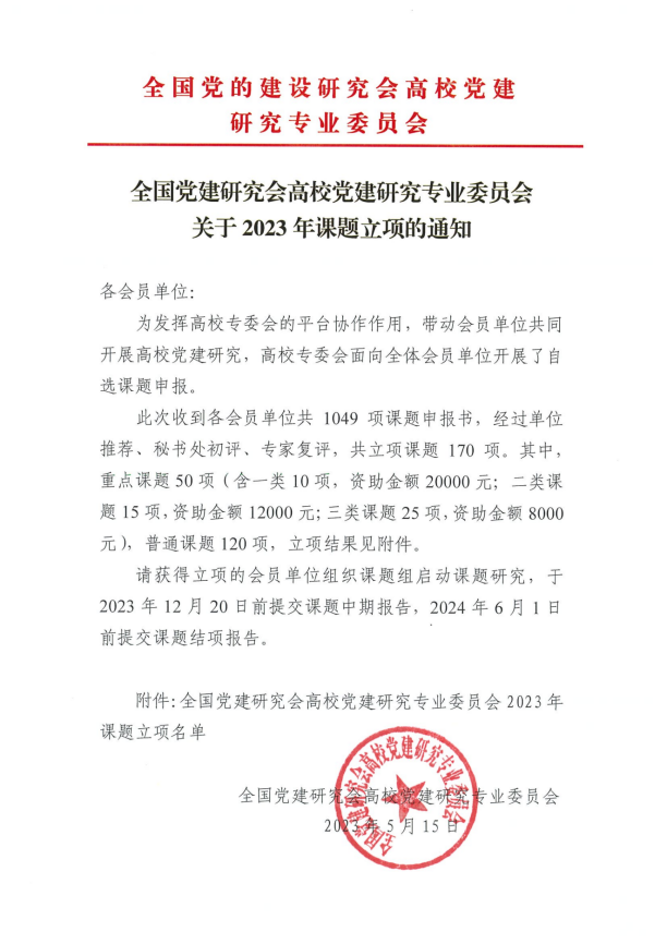 近日,全国党建研究会高校党建研究专业委员会发布了《全国党建研究会高校党建研究专业委员会关于2023年课题的通知》,经过单位推荐、秘书处初评、专家复评,桃子视频 申报的《新形势下高校基础学科青年教师思想政治工作高质量发展战略设计与实践路径研究》获重点三类课题(25项)立项。