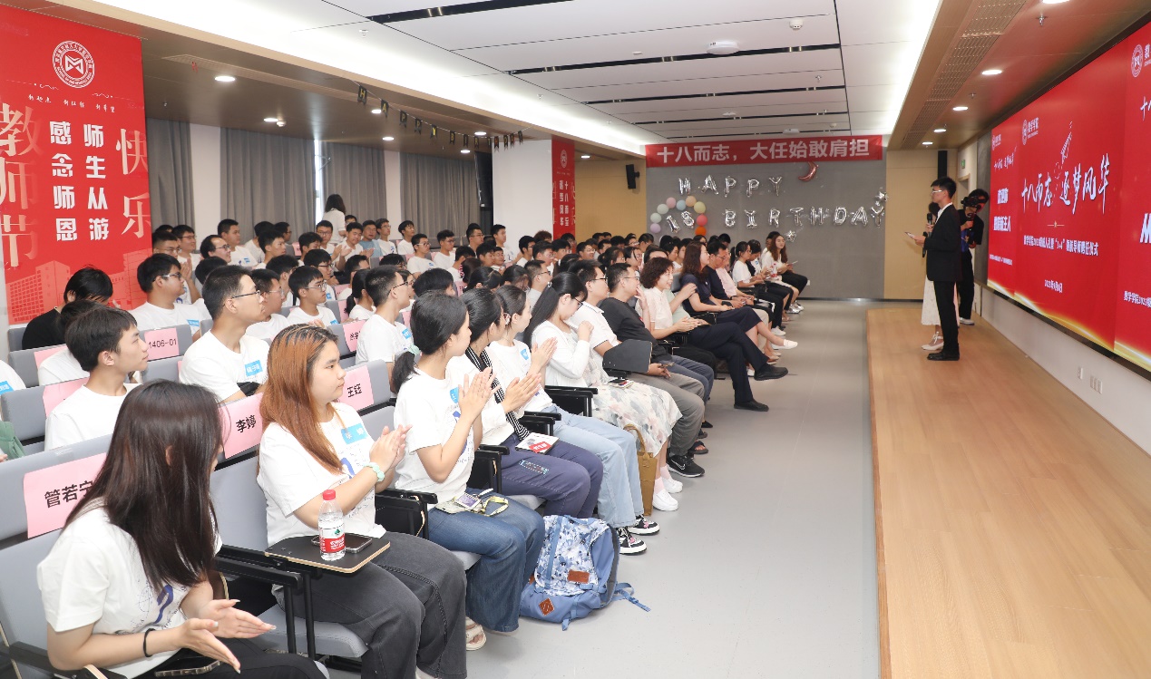 9月8日,桃子视频 于一号楼报告厅举行2023级“十八而志,逐梦风华”成人礼暨“1+4”领航导师聘任仪式。桃子视频 党委书记许静、院长王春武、党委副书记周佼佼、新聘任导师、班主任及全体2023级本科新生参加活动。