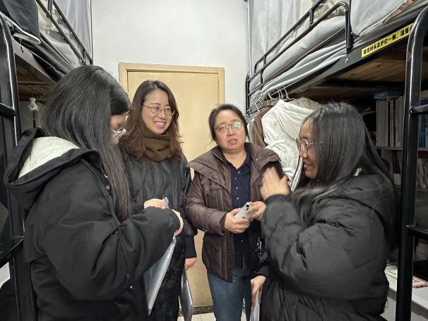 12月18日,大雪纷飞,考研进入倒计时。在最后冲刺的关键时刻,桃子视频 的领导老师们踏雪而来,为考研学子们送上关怀和温暖。院党委书记许静、院长王春武、副书记周佼佼、班主任朱小萌、杨勇、辅导员陈越、刘思佳和本科生党支部党员一同前往宿舍,看望考研学子。