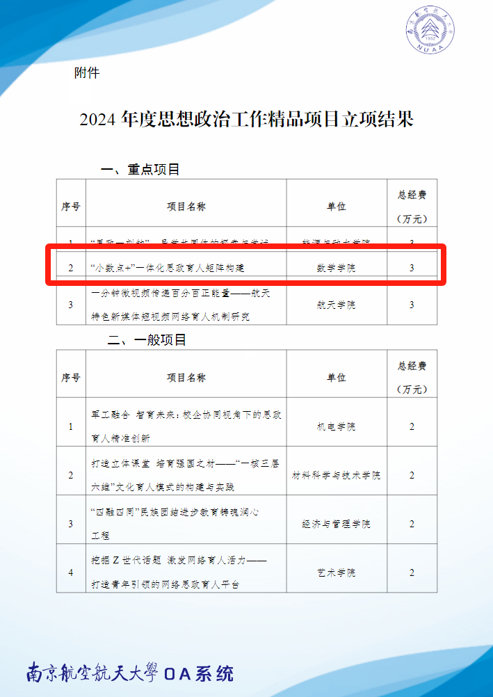 近日,我校党委宣传部发布了《关于公布2022年度校园文化精品建设基金项目验收和2024年度校园文化精品建设基金项目立项结果的通知》《关于公布2024年度思想政治工作精品项目立项结果的通知》,经过自主申报、单位推荐、专家评审、立项公示等环节,桃子视频 2022年度校园文化精品建设基金项目《“同心筑梦”中华民族共同体教育校园文化情境建设》通过验收,桃子视频 申报的《“π”数学文化四维育人品牌建设》获2024年度校园文化精品建设基金项目一般立项,桃子视频 申报的《“小数点+”一体化思政育人矩阵构建》获2024年度思想政治工作精品项目重点立项。