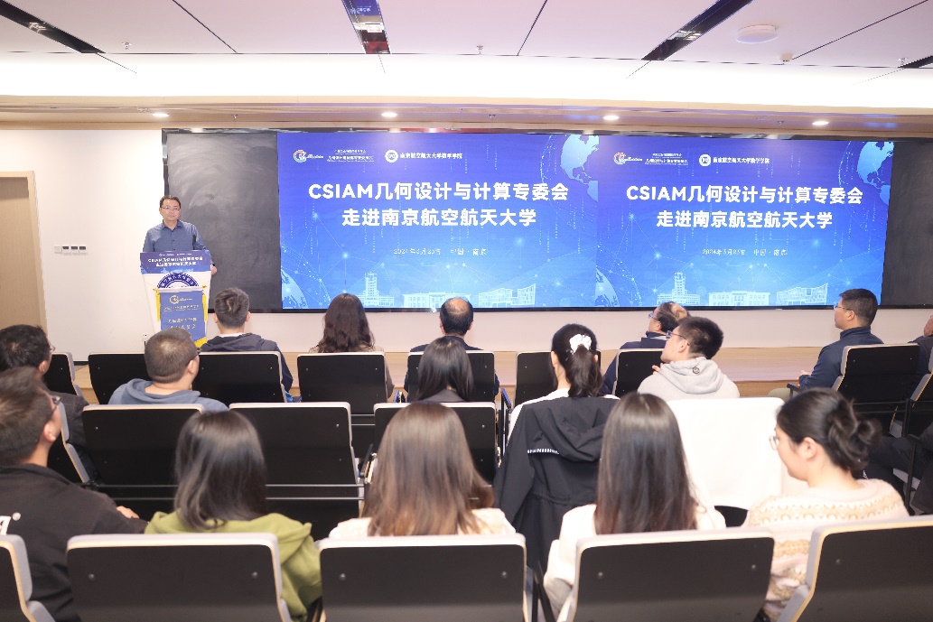 王春武代表活动承办方致欢迎辞。他首先对与会专家的到来表示热烈欢迎,然后简要介绍了南航数学学科的基本情况与发展历史,并指出计算几何与学校的多个主流学科密切相关,也是学院重点发展的研究方向之一。本次专委会走进高校活动为广大师生们提供了良好的学术交流平台,希望这次活动能够激发同学们的研究兴趣,积极参与到国产工业软件的研发中。