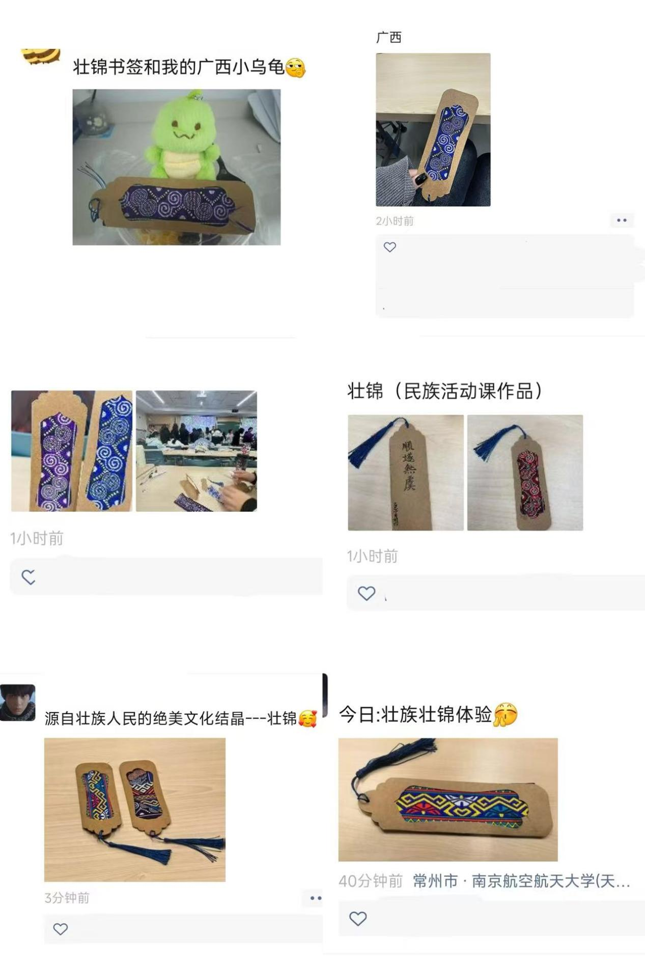 活动尾声,大家展示亲手制作的壮锦书签作品,深入交流实践感悟。同学们纷纷表示,通过本次体验直观领略了壮锦作为中国四大名锦的工艺精髓,深刻感受传统纺织技艺的文化底蕴,亲手创作的书签兼具纪念意义与文化价值。活动后,同学们通过社交平台分享作品与参与心得,一致认为本期“红石榴・微讲堂”以壮锦文化为载体,既实现了传统技艺的科普传承,又有效促进了各民族同学深化文化认知、增进情感联结,为铸牢中华民族共同体意识奠定坚实基础。