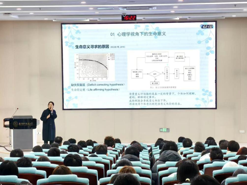 讲座伊始,王俊丽以经典电影情节为引,通过情节分析与情感共鸣,自然切入“生命意义”与“情绪调节”核心话题。在生命意义探寻环节,王俊丽从日常实践出发,分享四大实用路径:一是回归人群,在学习互助、志愿服务等情感联结中体验价值;二是主动尝试,多维度感受校园生活,拓宽生命体验边界;三是树立目标,制定涵盖学习、休息与成长的全面计划;四是坚持行动,以持续投入沉淀生命意义。
