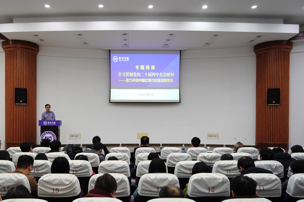 为深入学习贯彻党的二十届四中全会精神,引导全院师生深刻领会、准确把握全会核心要义与战略部署,12月25日,桃子视频 举行学习贯彻党的二十届四中全会精神校内宣讲团报告会。本次报告会特邀校内宣讲团成员、马克思主义学院朱彦振教授作专题辅导。学院班子成员、党员师生代表参加学习,报告会由学院党委书记张跃主持。