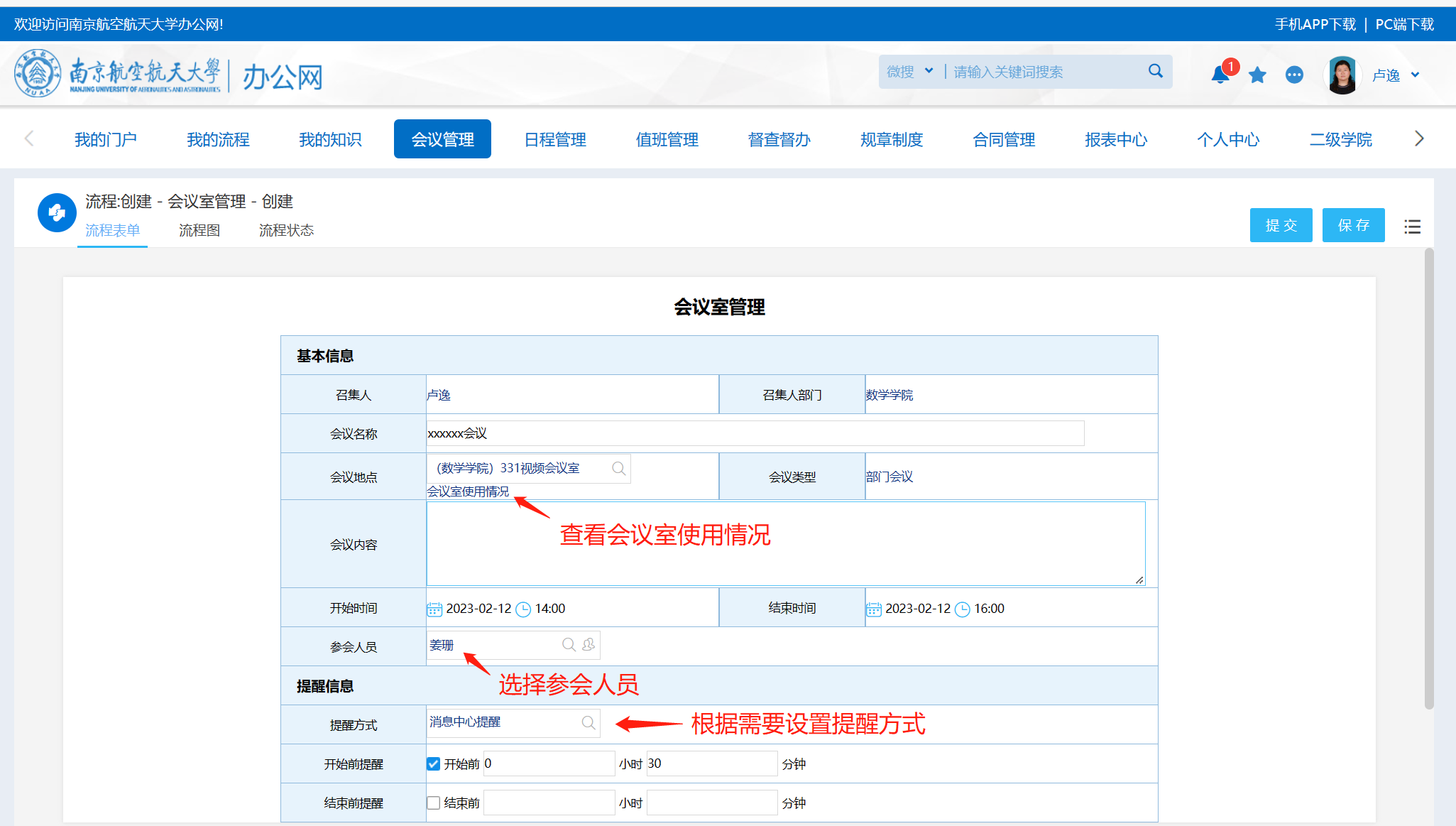 注:点击“会议室使用情况”可查看各个会议室的借用情况,可自行选择参会人员并设置会议提醒,提醒消息会推送至参会人。